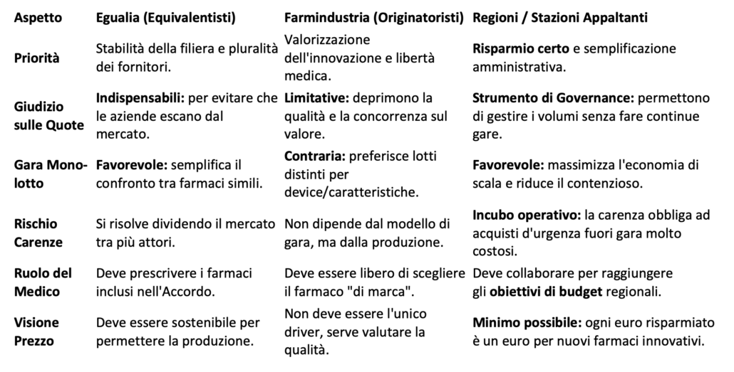 Potremmo azzardare un confronto tra le posizioni di queste due associazioni industriali, aggiungendo quella di Regioni e Aziende sanitarie che modula entrambe: