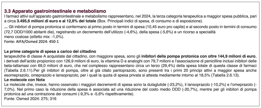 Secondo i dati del rapporto OsMed 2024, i PPI si collocano tra i farmaci a maggiore consumo e spesa nell’ambito dei medicinali per l’apparato gastrointestinale e metabolismo, con una spesa pubblica complessiva superiore a 600 milioni di euro annui (stima calcolata sulla base di dati citati nel Rapporto).